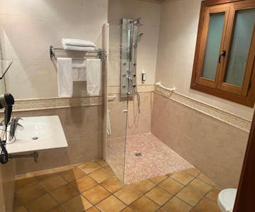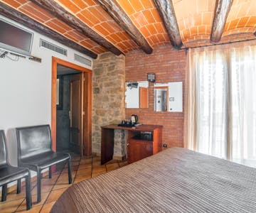 Habitación doble con cama de matrimonio en planta baja con aire acondicionado, tetera/cafetera, balcón con vistas a la montaña y baño privado con ducha a ras de suelo. Todas las habitaciones cuentan con minibar (nevera)